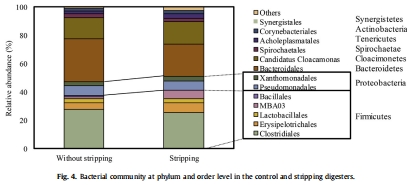數據:細菌群落以Firmicutes、Bacteroidetes、Cloacimonetes為主(TAN范圍5.8-6.8 g/L)。古菌群落中Methanosarcina sp.相對豐度在剝離消化器增加10%,氫營養型產甲烷菌豐度降低(從27%降至17%)。