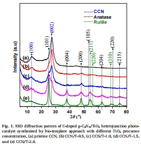 催化劑合成:以木棉纖維為生物模板,尿素為g-C3N4前體,鈦酸四丁酯為TiO2前體,通過水熱反應(150°C, 2 h)和煅燒(500°C, 2 h)一鍋法制備系列樣品(CCN/T-0.5至CCN/T-2.0,數字表示TiO2前體濃度,單位M)。木棉纖維提供C源,尿素貢獻N和C源,實現原位摻雜。