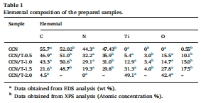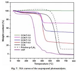 數據:TGA曲線顯示CCN含量隨TiO2濃度增加而減少(CCN/T-1.5為23.1%),CCN/T-2.0中CCN完全消失。