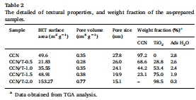 數據:BET分析顯示樣品為介孔結構(IV型等溫線),CCN/T-1.5比表面積較高(詳見表2),孔徑隨TiO2濃度增加而減小。