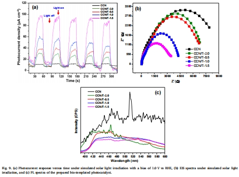 數據:光電流響應和EIS顯示CCN/T-1.5電荷分離效率最高(光電流最強,阻抗弧半徑最小);PL光譜強度最低。