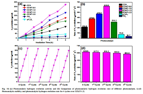 數據:產氫測試中CCN/T-1.5速率最高(625.5 μmol h?1 g?1),是純CCN的2.9倍;循環實驗顯示良好穩定性。