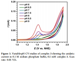 復(fù)合物3是一種有效的分子水氧化電催化劑,在中性至弱堿性pH(7-9)下操作,過電位約0.5 V,活性優(yōu)于類似吡啶系統(tǒng)(如復(fù)合物1)。