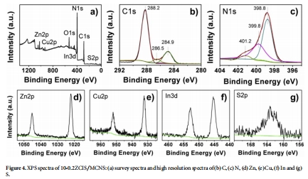 數據:高分辨率光譜顯示C 1s(288.2 eV)、N 1s(398.8 eV)、Zn 2p(1022.0 eV)、Cu 2p(932.3 eV)、In 3d(445.3 eV)、S 2p(163.3 eV)的特征峰。