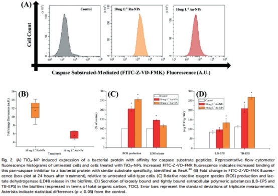 揭示不同晶型TiO2-NPs(An-NPs和Ru-NPs)對淡水生物膜的毒性機制差異,包括細胞死亡模式、ROS產生和抗氧化響應。