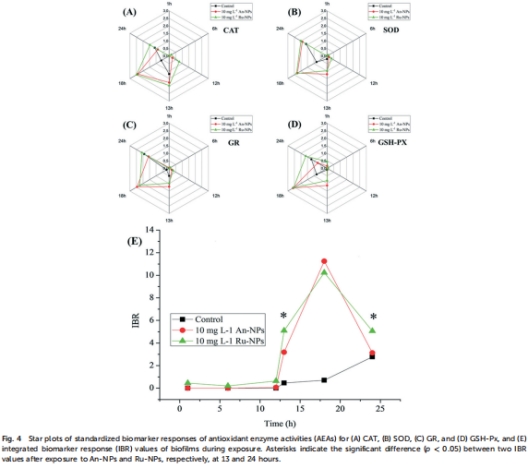 研究意義:IBR綜合了多種酶活性,有效評估生物膜健康狀態。An-NPs的急性效應與光氧化相關,Ru-NPs的漸進毒性與滲透和細胞內ROS相關。