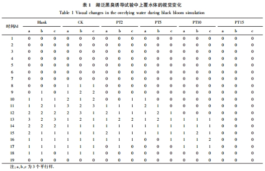 數據:Blank、CK、PT2、PT5、PT10組在第8-14天相繼出現黑臭(水色等級2-3),PT15組未黑臭(等級0)。