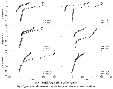 數據:黑臭前,翻耕組Eh向空白組恢復;黑臭后,黑臭組界面Eh<100 mV,PT15組為123 mV。