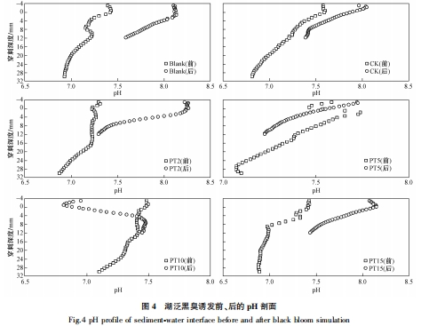 數據:黑臭后所有組界面pH升高,PT15組增幅最小。