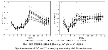 數據:黑臭組Fe2?和S2?濃度峰值顯著,PT15組濃度低且穩定(Fe2?為黑臭組的46.7%-79.5%,S2?為57.1%-75.0%)。