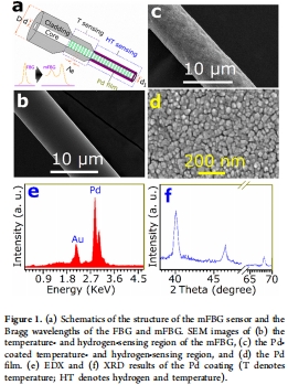 傳感器制備與表征:通過濕法蝕刻制備mFBG傳感器,形成溫度傳感區和溫度-氫傳感區;Pd膜通過濺射沉積并表征其均勻性、純度和結構(SEM、EDX、XRD)。