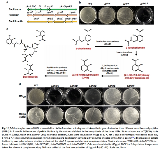 數(shù)據(jù):dhbA、dhbB、dhbC突變體顯示嚴(yán)重生物膜缺陷,而dhbE和dhbF突變體表型正常;補(bǔ)充DHB(1 μg/mL)能挽救突變體表型。
