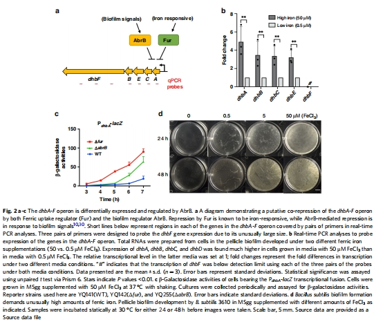 數(shù)據(jù):RT-qPCR顯示dhbA、dhbB、dhbC、dhbE在生物膜中高表達(dá),但dhbF表達(dá)低于檢測(cè)限;β-半乳糖苷酶活性證實(shí)AbrB和Fur共同調(diào)控dhb操作子。
