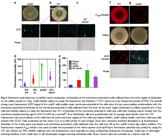 數(shù)據(jù):ThT熒光顯示ΔsdhC突變體膜電位低;野生型生物膜外圍細(xì)胞膜電位高,與基質(zhì)基因表達(dá)正相關(guān)。