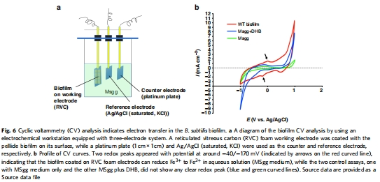 數(shù)據(jù):循環(huán)伏安法顯示生物膜涂層電極能還原Fe3?( redox peaks at -40/-170 mV),而對(duì)照無(wú)此現(xiàn)象。