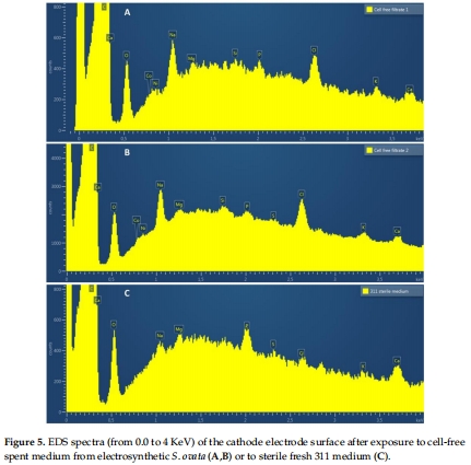 數(shù)據(jù):EDS顯示上清液暴露的陰極表面有鈷(X射線計數(shù)50-120)和鎳(60-140),無菌介質(zhì)中未檢測到。