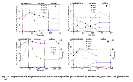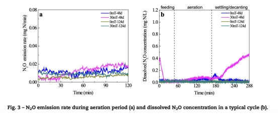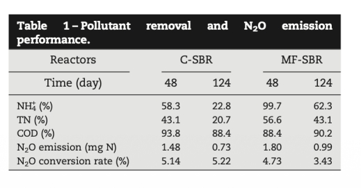 2 運行周期內(nèi)N2O和氮化合物變化數(shù)據(jù):來自圖2和圖3,顯示N2O主要在沉降和排水期通過反硝化產(chǎn)生,好氧期與亞硝酸鹽積累相關(guān)。研究意義是揭示N2O產(chǎn)生時段和途徑,磁場通過促進亞硝酸鹽轉(zhuǎn)化和反硝化酶活性減少N2O積累,優(yōu)化過程控制。