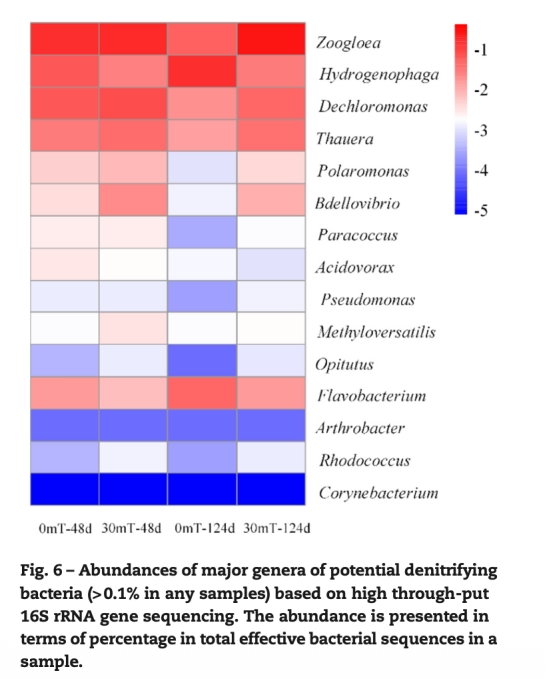3 微生物群落分析顯示磁場促進AOB(Nitrosomonas)、NOB(Nitrospira)和反硝化菌(如Zoogloea)的豐度,優(yōu)化菌群結(jié)構(gòu)以實現(xiàn)高效脫氮和N2O減排。