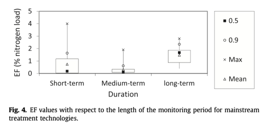 1 N2O排放因子在不同處理過程中差異顯著,主流過程EF范圍0.01%-2%,側(cè)流過程更高,監(jiān)測(cè)持續(xù)時(shí)間影響EF估值,長期監(jiān)測(cè)更準(zhǔn)確。