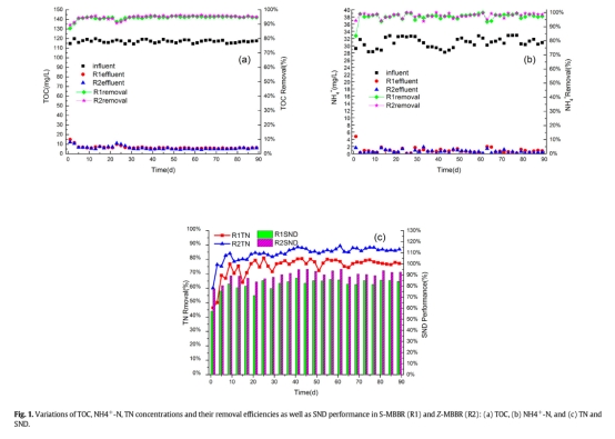 1 TOC、NH4+-N、TN濃度及去除效率數據:來自圖1,顯示Z-MBBR和S-MBBR的TOC和NH4+-N去除率均高于94%和97%,但Z-MBBR的TN去除率(84.2±4.8%)和SND性能(90.7±4.1%)顯著高于S-MBBR(75.1±6.8%和81.7±6.5%)。研究意義是證實新型載體通過增強反硝化能力提高脫氮效率,為優化載體設計提供依據。