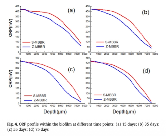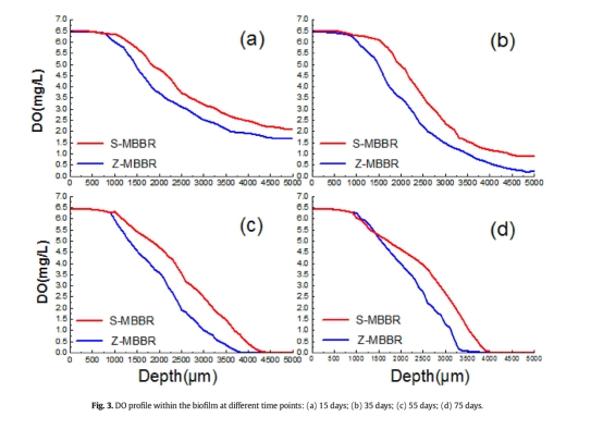 3 DO和ORP剖面數據:來自圖3和圖4,微電極測量顯示Z-MBBR生物膜內部DO濃度更低(如55天時在3800μm處降至零),ORP也更低(75天時中心ORP為9mV,低于S-MBBR的25mV)。研究意義是揭示新型載體創造更強缺氧環境,促進反硝化過程,直接解釋SND性能提升的原因。