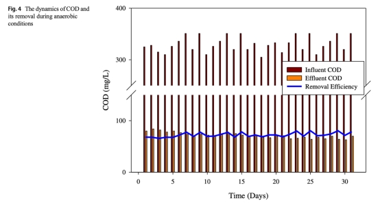 1 COD去除數據:來自圖1(好氧)和圖4(厭氧),顯示好氧條件下COD去除率高達90%,厭氧條件下為68-80%。研究意義是確認好氧處理更高效于碳去除,厭氧處理中COD貢獻于甲烷生成,為優化碳去除策略提供依據。