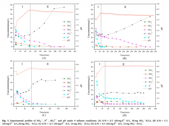研究采用實(shí)驗(yàn)室規(guī)模的序批式生物膜反應(yīng)器,進(jìn)行一系列批式試驗(yàn),設(shè)置四種不同進(jìn)水條件(變化硫化物和亞硝酸鹽濃度)。通過(guò)脈沖投加方式引入底物,在線監(jiān)測(cè)NO、N2O、DO、pH等參數(shù),并分析硫化物、硫酸鹽濃度變化。同時(shí),使用高通量測(cè)序分析微生物群落結(jié)構(gòu),以全面理解SOAD過(guò)程中的生物地球化學(xué)行為。