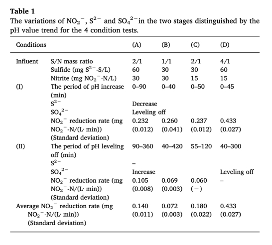 2 pH、硫化物、硫酸鹽濃度數(shù)據(jù),來(lái)自Fig. 1和Table 1。研究意義在于區(qū)分硫化物氧化的兩個(gè)階段(先氧化為S0再氧化為SO4^2-),pH變化作為階段劃分指標(biāo),幫助理解反應(yīng)進(jìn)程和效率。