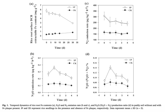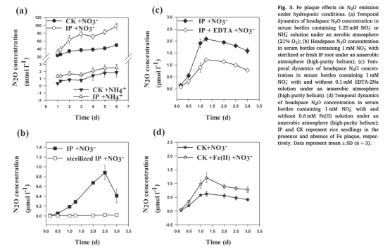 2. N2O和N2排放速率及N2O/(N2O+N2)比率:IP處理下N2O和N2排放加倍,比率升高。研究意義在于量化鐵膜對(duì)氮損失和溫室氣體排放的增強(qiáng)作用,表明其促進(jìn)反硝化全過(guò)程。數(shù)據(jù)來(lái)自Fig. 1b-d。