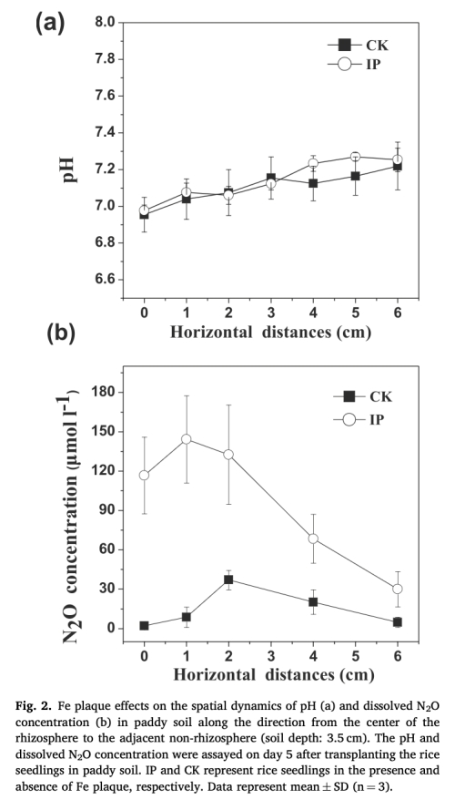 3. 根際pH和溶解N2O濃度空間分布:IP處理下根際溶解N2O濃度更高,pH無(wú)顯著差異。研究意義在于揭示鐵膜創(chuàng)造局域化學(xué)熱點(diǎn),直接關(guān)聯(lián)N2O產(chǎn)生。數(shù)據(jù)來(lái)自Fig. 2。