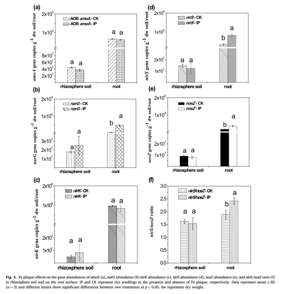 4. 功能基因豐度(amoA, narG, nirK, nirS, nosZ):IP處理提高根表narG、nirS和nosZ基因豐度及nirS/nosZ比率,而amoA無(wú)變化。研究意義在于從分子層面證實(shí)鐵膜偏好影響反硝化基因,增強(qiáng)N2O產(chǎn)生潛力。數(shù)據(jù)來(lái)自Fig. 4。