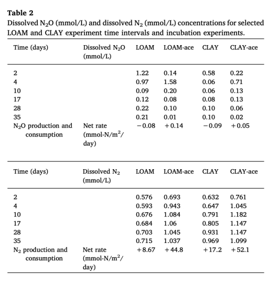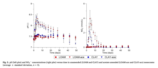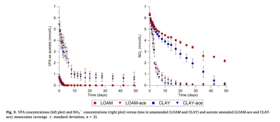 1 NO??和乙酸鹽消耗數據,來自Fig.3。研究意義:乙酸鹽添加組(LOAM-ace和CLAY-ace)NO??在10天內去除90%以上,而對照組(LOAM和CLAY)去除率僅50-67%,證明易分解有機質是反硝化關鍵限制因子,指導農業中添加有機質以增強脫氮。