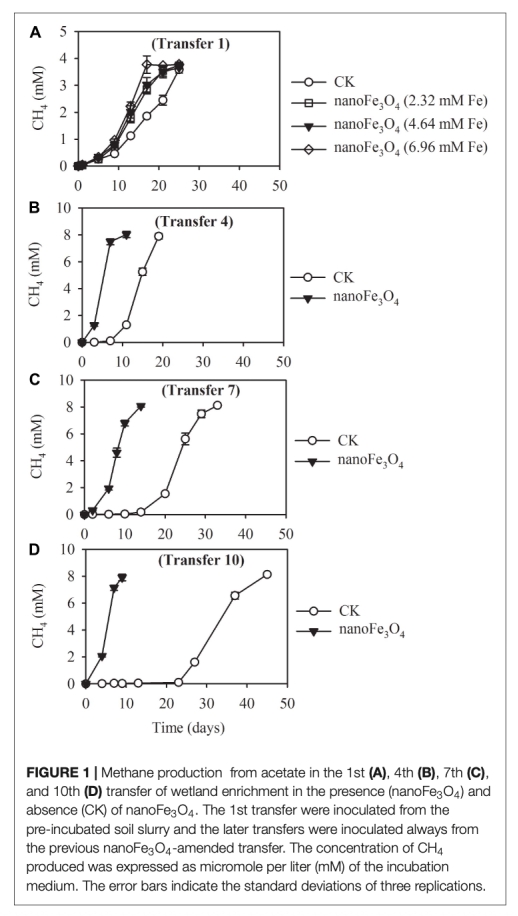 1 甲烷產量和乙酸消耗數據:來自Figure 1和Figure 2。數據顯示,添加納米Fe3O4顯著縮短了產甲烷的滯后期并提高了最大產甲烷速率,且在富集培養和純培養中均觀察到促進作用。研究意義在于直接證明了納米Fe3O4對乙酸營養型產甲烷的增強效應,而非通過促進互營途徑。