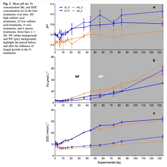 研究意義:評估有機質對鐵復合作用的影響,表明DOC在無氧條件下增加,但高硫酸鹽降低DOC,而鐵遷移仍增強,說明酸度和還原條件更關鍵。數據來自Fig. 2c。