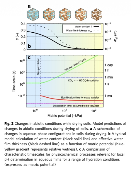 2. 物理化學(xué)過(guò)程的時(shí)間尺度數(shù)據(jù):模型分析干燥過(guò)程中氣體交換、擴(kuò)散和反應(yīng)的時(shí)間尺度(Fig. 2c)。研究意義在于揭示水膜變薄時(shí)擴(kuò)散成為限制因素,導(dǎo)致化學(xué)物質(zhì)局部積累和pH異質(zhì)性,解釋排放動(dòng)態(tài)。