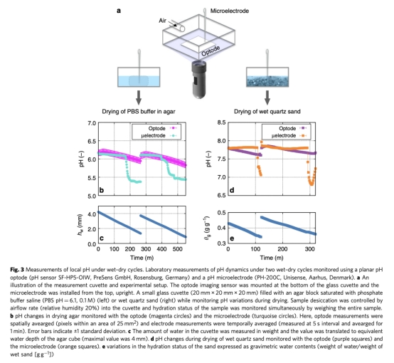 4. 空間分辨pH測(cè)量數(shù)據(jù):實(shí)驗(yàn)室使用平面光極和Unisense微電極測(cè)量 sterilised quartz sand 在干燥過(guò)程中的pH變化,顯示pH降低和空間異質(zhì)性(Fig. 3, Fig. 4)。研究意義在于直接驗(yàn)證模型預(yù)測(cè),證實(shí)干燥過(guò)程中pH局部化的發(fā)生,支持微觀過(guò)程主導(dǎo)氣體排放的假設(shè)。