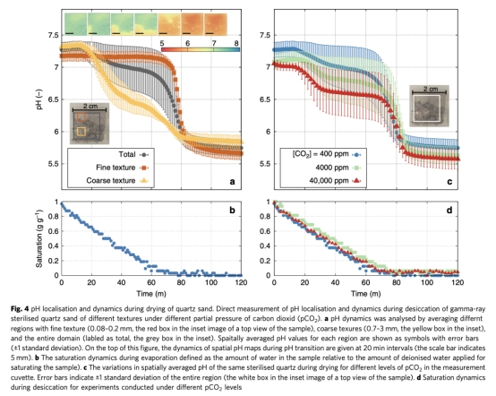 研究思路結(jié)合機(jī)制模型和實(shí)驗(yàn)室實(shí)驗(yàn)。首先,開(kāi)發(fā)了一個(gè)機(jī)制模型(沙漠生物結(jié)皮模型,DBM),模擬干燥過(guò)程中水膜厚度分布、微生物活動(dòng)、pH變化和氣體排放的耦合過(guò)程。模型考慮了水含量、matric potential、氣體擴(kuò)散、酸堿平衡和微生物功能群(如硝化菌)。其次,進(jìn)行實(shí)驗(yàn)室實(shí)驗(yàn),使用平面光極(PreSens)和微電極(Unisense)測(cè)量干燥過(guò)程中 sterilised quartz sand 的pH空間分布和動(dòng)態(tài)變化,以驗(yàn)證模型預(yù)測(cè)。實(shí)驗(yàn)包括控制干燥速率、大氣CO2和NH3水平,并監(jiān)測(cè)水含量和pH變化。