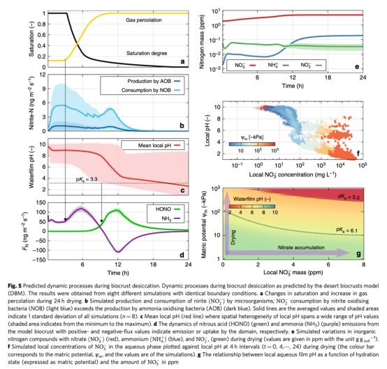 6. 微生物活動(dòng)和化學(xué)物質(zhì)數(shù)據(jù):模型預(yù)測(cè)硝化菌活動(dòng)、NO3積累和局部pH變化(Fig. 5e, f, g)。研究意義在于闡明微生物過(guò)程通過(guò)NO3積累驅(qū)動(dòng)局部酸化,從而促進(jìn)HONO排放。