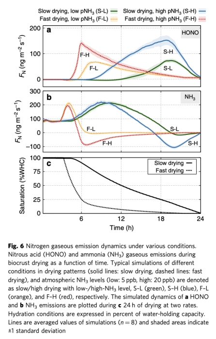 摘要指出,土壤中的微觀尺度相互作用可能導(dǎo)致高度局部化的條件,從而不成比例地影響氮轉(zhuǎn)化過(guò)程。研究通過(guò)機(jī)制模型模擬了土壤表面和生物結(jié)皮干燥過(guò)程中耦合的生物和非生物過(guò)程,表明局部微生物活動(dòng)與薄水膜內(nèi)的pH變化共同增強(qiáng)了土壤干燥過(guò)程中亞硝酸(HONO)和氨(NH3)的排放,遠(yuǎn)高于基于平均水分條件和整體土壤pH的預(yù)測(cè)值。模型預(yù)測(cè)與干燥生物結(jié)皮的反應(yīng)性氮?dú)怏w通量測(cè)量案例一致,顯示土壤和生物結(jié)皮干燥速率影響HONO和NH3排放動(dòng)態(tài),且大氣NH3水平對(duì)反應(yīng)性氮?dú)怏w損失有強(qiáng)烈影響。實(shí)驗(yàn)室測(cè)量證實(shí)了微觀pH局部化的發(fā)生,強(qiáng)調(diào)了微環(huán)境在陸地生態(tài)系統(tǒng)生物地球化學(xué)通量中的關(guān)鍵作用。