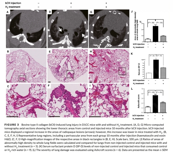 2 肺部CT密度:使用micro-CT成像,量化高密度區(qū)域比例,膠原注射組增加,H2治療減輕(圖3A,D,G,J)。研究意義:直觀顯示H2對肺部病變的改善作用。