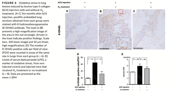 6 氧化應激標志物:血清LPO水平(硫代巴比妥酸反應物質法)和肺部8-OHdG陽性細胞數(shù)(免疫組化)在膠原注射組增加,H2治療顯著降低(圖6D,E)。研究意義:證實氧化應激參與RA-ILD發(fā)病,且H2通過抗氧化機制發(fā)揮作用。