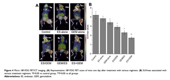 3 18F-FDG PET/CT成像數(shù)據(jù)來(lái)自圖4。ES+GEM組SUVmax值最低(1.73±0.12),表明腫瘤代謝活性最低,治療效果最佳。