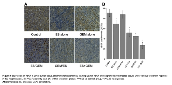 5 VEGF表達(dá)數(shù)據(jù)來(lái)自圖6。ES+GEM組VEGF陽(yáng)性率最低(27.18%),表明同時(shí)給藥最強(qiáng)抑制血管生成。