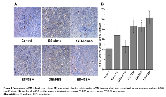 6 α-SMA表達(dá)數(shù)據(jù)來(lái)自圖7。ES+GEM組α-SMA陽(yáng)性血管數(shù)最多(10.33個(gè)/mm2),表明血管成熟度和正?;潭茸罡?。