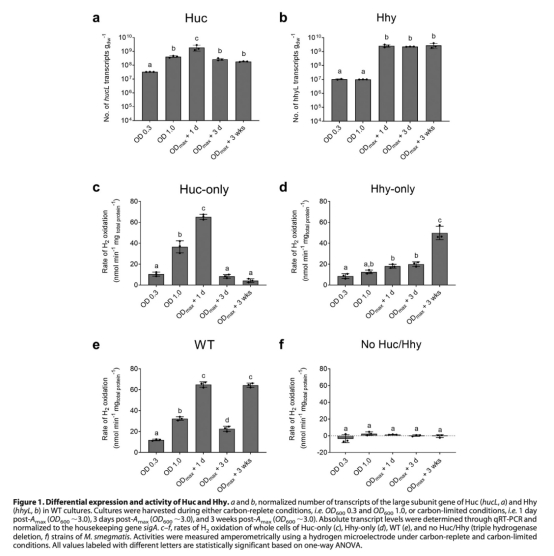 1 基因表達數據:通過qRT-PCR測量hucL和hhyL轉錄水平,顯示Huc在碳限制早期(1天后Amax)高表達,Hhy在持久期(3周后Amax)高表達(圖1a,b)。研究意義:揭示氫化酶的差異時序調節,適應生長過渡和持久維持的能量需求。