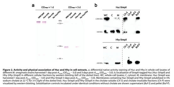 4 細胞分餾和Western blot:顯示Huc和Hhy的膜關聯性,Huc可被膽酸鹽溶解,Hhy更緊密膜結合(圖2b)。研究意義:揭示氫化酶與膜的不同相互作用方式,Huc可能通過蛋白互作關聯,Hhy可能更直接嵌入。