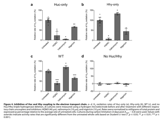 6 抑制劑實驗:使用HQNO(menaquinone抑制劑)和鋅疊氮(細胞色素bcc-aa3抑制劑)顯示氫化酶活性依賴menaquinone和終端氧化酶(圖3b,c,圖4)。研究意義:確認電子通過menaquinone池傳遞,且Huc主要耦合細胞色素bcc-aa3,Hhy更靈活也耦合細胞色素bd。