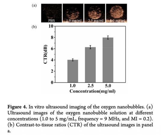 3 超聲成像數據來自圖4,顯示納米氣泡濃度依賴的超聲對比增強。研究意義是證明納米氣泡可作為超聲對比劑,用于成像引導的氧輸送和實時監測。