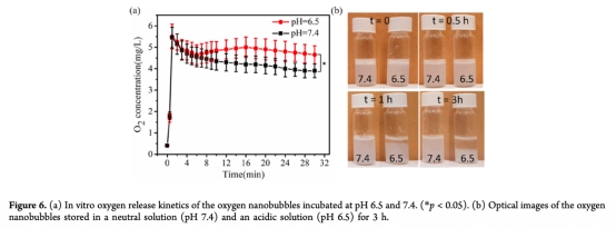 5 體外氧釋放動力學數據來自圖6a,顯示在pH 6.5和7.4條件下氧釋放曲線,pH 6.5時釋放更快。研究意義是證實納米氣泡的pH響應性,在酸性環境中加速氧釋放,模擬腫瘤微環境。