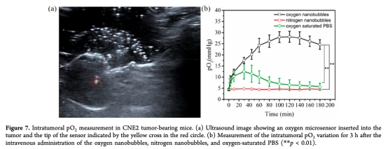 6 體內氧分壓數據來自圖7b,使用丹麥Unisense微電極測量,顯示腫瘤內pO2在納米氣泡注射后增加約6倍。研究意義是直接證明納米氣泡在體內有效提高腫瘤氧水平,緩解缺氧,增強治療效果。